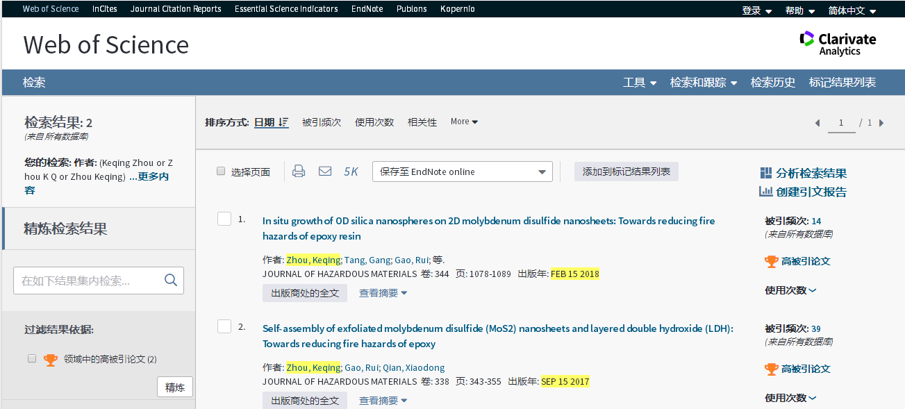 基本科学指标数据库(Essential Science Indicators,简称ESI)最新数据显示,安全工程系周克清老师发表的论文“In situ growth of 0D silica nanospheres on 2D molybdenum disulfide nanosheets: Towards reducing fire hazards of epoxy resin”入选高被引论文。该论文是周克清老师以中国地质大学(武汉)开云online(中国)为第一单位、第一作者和通讯作者身份发表的第2篇ESI高被引论文。2018年7月周克清老师发表的论文“Self-assembly of exfoliated molybdenum disulfide (MoS2) nanosheets and layered double hydroxide (LDH): Towards reducing fire hazards of epoxy”曾同时入选ESI高被引论文和热点论文。