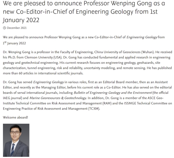 (通讯员:黄静)近日,开云online(中国)龚文平教授受邀担任国际期刊Engineering Geology共同主编(Co-Editor-in-Chief)。龚文平教授的此次任职将有助于促进我校在工程地质相关领域与国内外学者的交流合作,并提升我校在工程地质相关领域的国际影响力。