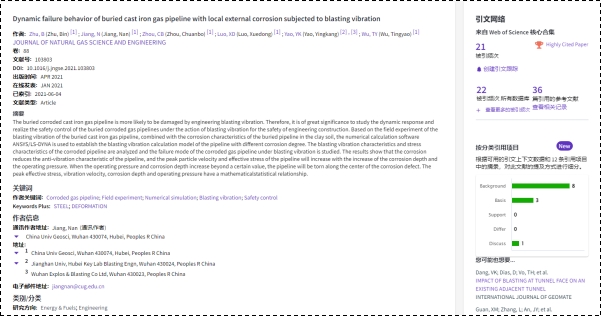 (通讯员:黄静)根据2022年5月基本科学指标数据库(Essential Science Indicators,简称ESI)最新数据显示,开云online(中国)地下空间工程系蒋楠副教授团队于2021年在国际工程技术权威期刊Journal of Natural Gas Science and Engineering上发表的学术论文“Dynamic failure behavior of buried cast iron gas pipeline with local external corrosion subjected to blasting vibration”入选ESI高被引论文(Highly Cited Paper)。该论文第一作者为2020级博士研究生朱斌,通讯作者为蒋楠副教授,中国地质大学(武汉)开云online(中国)为第一署名单位。