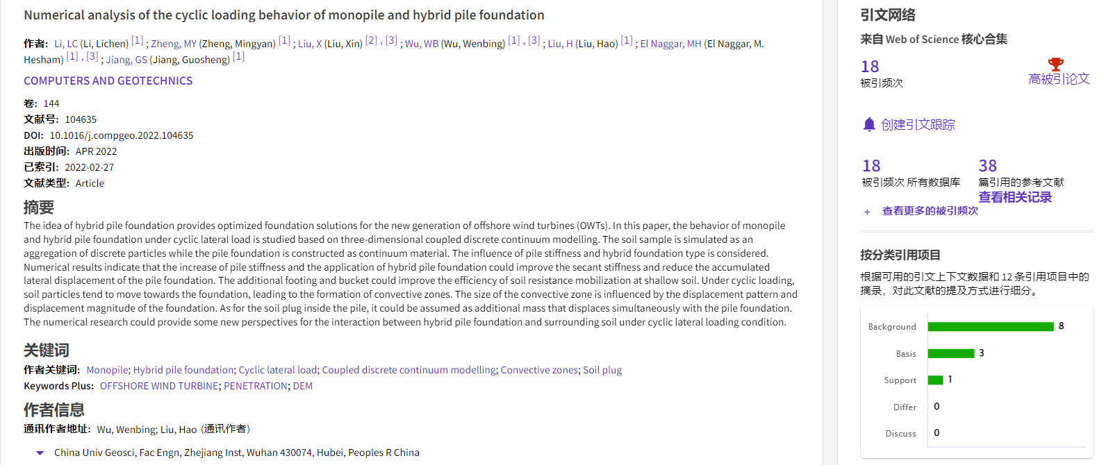 根据2022年11月基本科学指标数据库(Essential Science Indicators,简称ESI)最新数据显示,开云online(中国)勘察与基础工程系吴文兵教授团队于2022年在国际岩土工程数值模拟权威期刊Computers and Geotechnics上发表的学术论文“Numerical analysis of the cyclic loading behavior of monopile and hybrid pile foundation”入选ESI高被引论文。该论文第一作者为勘察与基础工程系博士后李立辰,通讯作者为吴文兵教授,中国地质大学(武汉)开云online(中国)为第一署名单位。