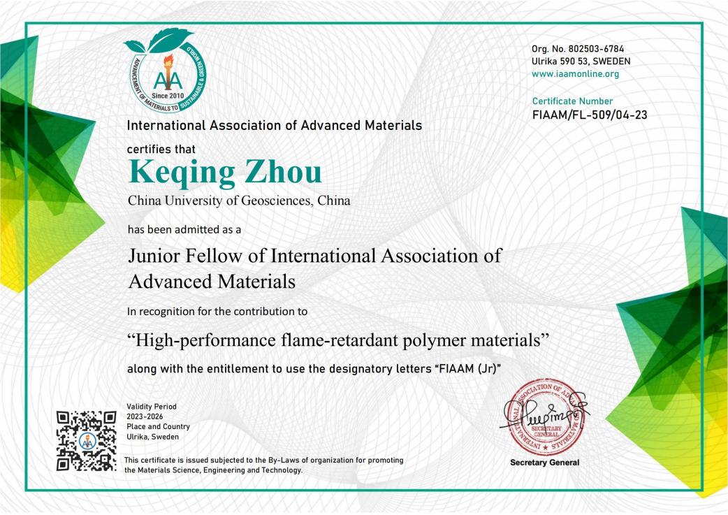 (通讯员 黄静)近日,中国地质大学(武汉)开云online(中国)周克清特任教授收到国际先进材料学会(International Association of Advanced Materials, IAAM)执委会发来的贺函,祝贺他当选为国际先进材料学会青年会士(Junior Fellow of IAAM, FIAAM)。周克清特任教授受邀在美国奥兰多举办的复合材料研讨会(Composite Materials Congress)上发表题为“Functionalized 2D molybdenum disulphide working on high-performance flame-retardant polymer materials”的IAAM Fellow演讲,会上获颁青年会士“Junior Fellow”证书,以表彰他在“高性能阻燃聚合物材料”领域做出的杰出贡献。