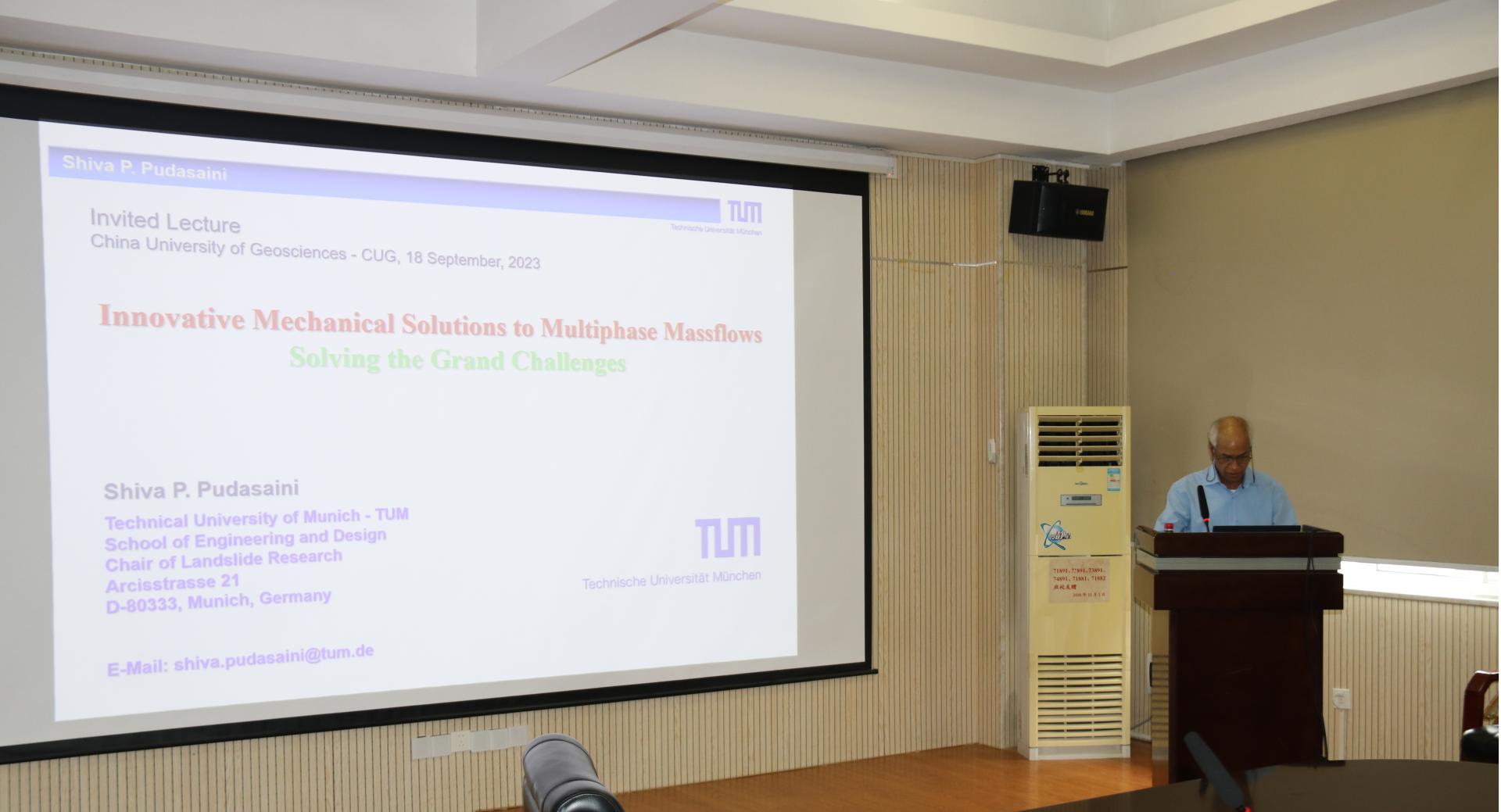 Shiva P. Pudasaini教授作了题为“Innovative Mechanical Solutions to Multiphase Massflows”的学术报告。该报告从物理力学的角度对多相物质运动问题,如滑坡、泥石流、雪崩等运动过程,进行了深入的探讨,详细阐述了这些问题的关键难点和创新解决方案。同时,介绍了其团队基于GIS开发的多相流模拟开源软件r.avaflow,并生动形象地展示了该软件在各种复杂地形下多相物质运动的数值模拟结果。