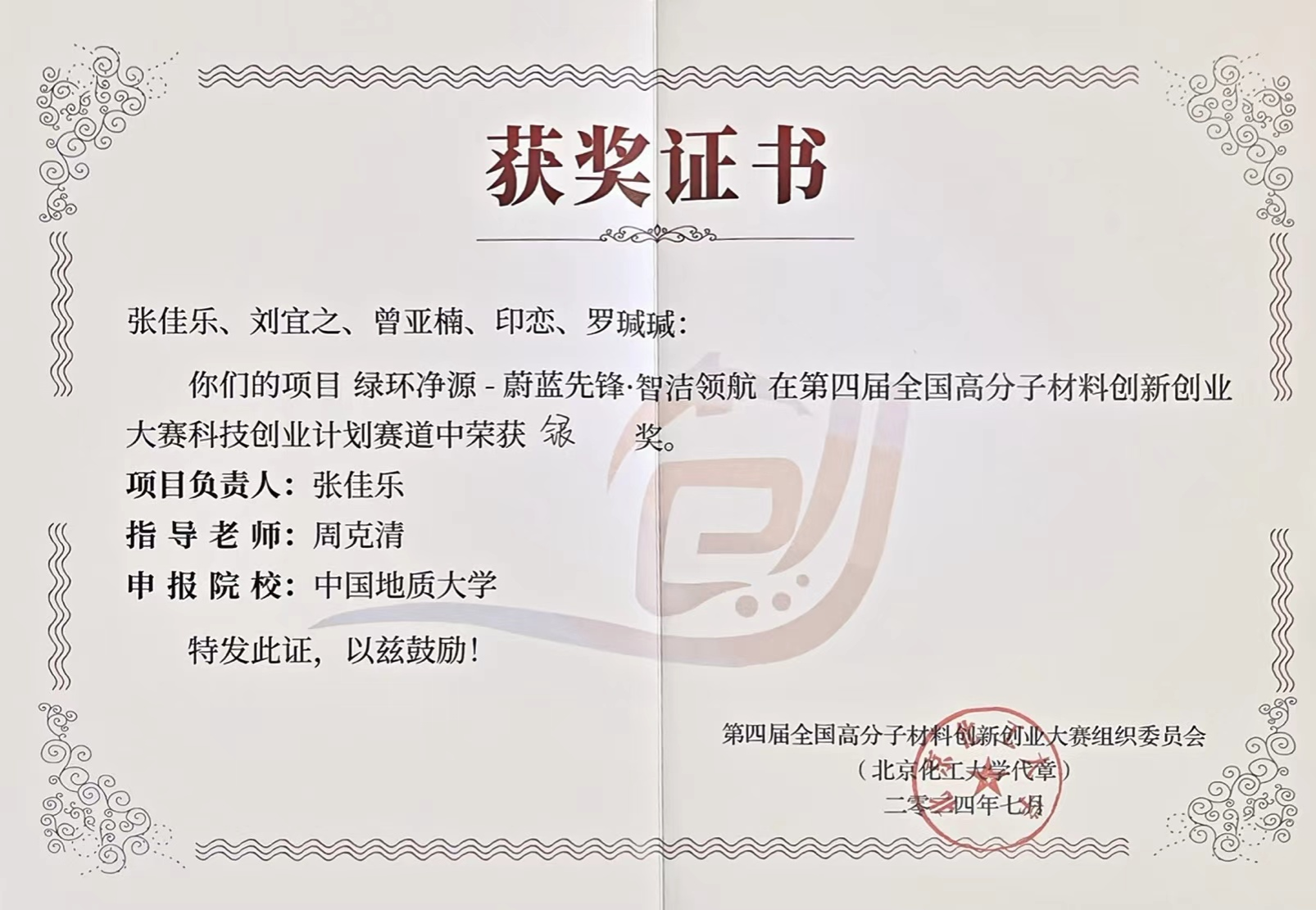 周克清特任教授指导的《绿环净源-蔚蓝先锋·智洁领航》项目荣获第四届全国高分子材料创新创业大赛科技创业计划赛道银奖。项目团队成员包括开云online(中国)安全工程系本科生张佳乐、刘宜之、博士研究生生印恋、罗瑊瑊和马克思主义学院本科生曾亚楠。