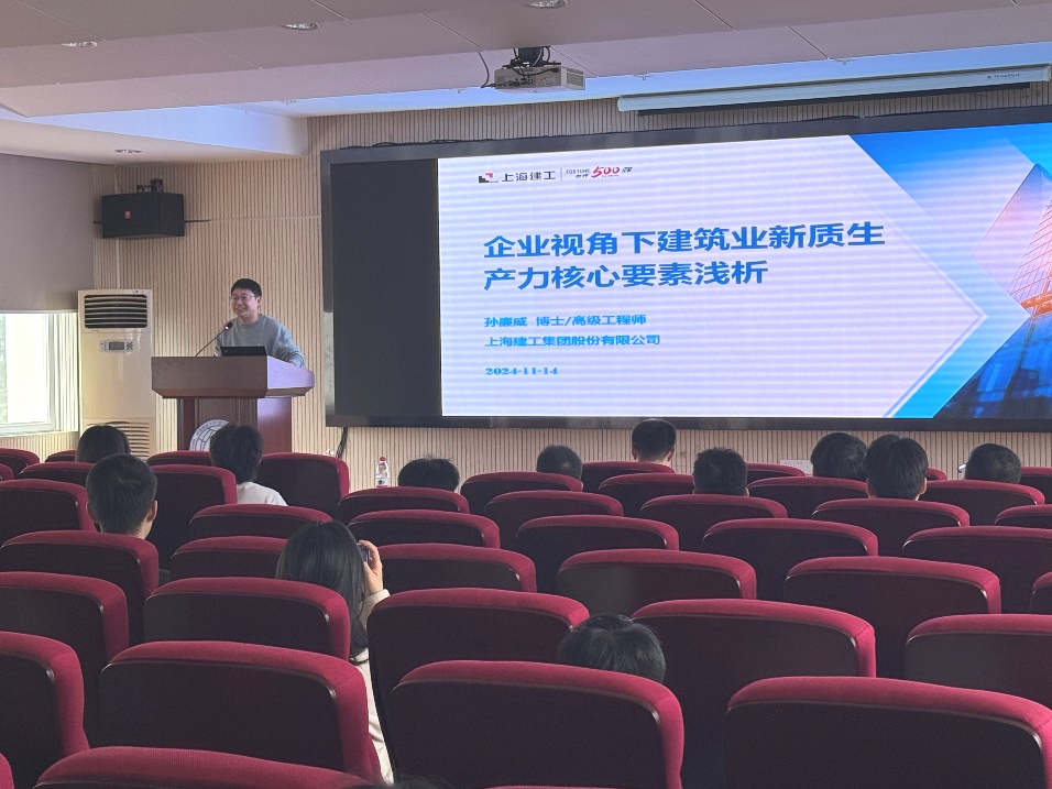 孙廉威院长以“企业视角下建筑业新质生产力核心要素浅析”为主题,首先通过行业实例说明了当前建筑行业和土木工程行业的发展现状,并且对企业发展的瓶颈进行了阐述。随后,从企业角度提出了发展新质生产力的思考,新质生产力是推动建筑业转型发展的内在需求,也是推动建筑业颠覆性变革的重要着力点。孙廉威院长结合他自身及团队在企业进行科技创新工作实例,分析提出了建筑业新质生产力的核心要素。最后,孙廉威院长向同学们分享了企业对复合型人才的迫切需求,并详细讲解了如何通过培养多领域技能和知识,将自己塑造成为企业急需的复合型人才,从而增强个人的职业竞争力。