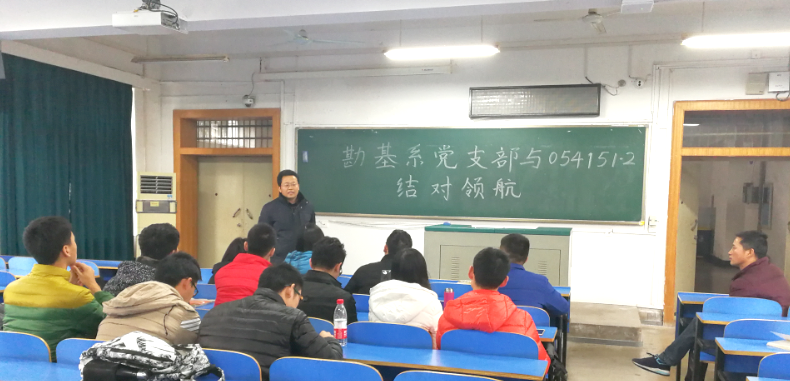 2017年12月7日下午2:30-4:30,勘基系党支部支委成员与勘查技术与工程专业的054151班和054152班全体党员在教一楼205室开展了“引领成长,共创卓越”的“结对领航”活动。活动由勘基系党支部书记段隆臣同志主持。段老师首先介绍了师生党支部“结对领航”活动的目的、意义,并在与学生商量后确定了勘基系师生党支部“结对领航”活动的长效机制,并希望将“结对领航”活动推广到两个班级的全体同学。随后,段隆臣老师、潘秉锁老师和吴文兵老师先后跟同学们分享了自己的成长经历,并将自己的成功与失败的经验与大家分享。最后,开展师生交流讨论,参会同学先后就“本-硕-博”贯通制培养模式、考研与保研、就业方向的困惑、勘查与技术工程专业发展前景等进行了提问,三位老师结合自身及学长学姐们的情况对所提问题进行了详细的解答。